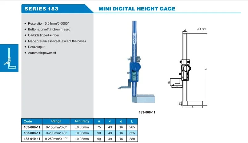 کولیس های پایده دار دیجیتالی 183 خوانایی بسیار بالایی دارند، این یعنی بر خلاف کولیس های معمولی شما نیاز به تنظیم ابعاد قطعه با کولیس، اندازه گیری قطعه و محاسبات اضافی ندارید. که این علاوه بر اینکه خطای انسانی اندازه گیری را محاسباتی را کاهش میدهد، همچنین باعث صرفه جویی در وقت شما نیز میشود. این کولیس بعلاوه توانایی ذخیره و نگهداری اطلاعات و اندازه گیری در مقیاس میلی متر و اینچ را دارد. مجموعه ی ابزار سیار این محصول را در سه سایز 15، 20 و 30 سانتی متری میفروشد. این کولیس ها میتوانند به ترتیب قطعاتی با ارتفاع های 150-0 میلی متر، 200-0 میلی متر و 250-0 میلی متر را اندازه گیری کنند. البته برای این کولیس امکان اندازه گیری با مقیاس اینچ نیز وجود دارد. این وسیله علاوه بر دکمه ی خاموش روشن دارای قابلیت خاموش شدن خودکار برای حفظ توان باتری است.