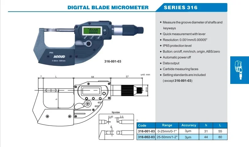 | سایر توضیحات | توانایی اندازه گیری انواع شیار و قطر شفت و بلبرینگ, توانایی اندازه گیری به اینچ و میلی متر, توانایی اندازه گیری مطلق یا افزایشی, خاموش شدن دستگاه به صورت خودکار, دارای برگه کالیبره, دارای درگاه خروجی اطلاعات, دارای دکمه on / off، صفر، میلی متر/ اینچ، ABS/REL، ORIGIN, دارای دکمه zero جهت صفر کردن داده ها در هر نقطه, مطابق استاندارد IP65 ضد آب و گرد و غبار, مناسب برای اندازه گیری خارج قطعات |