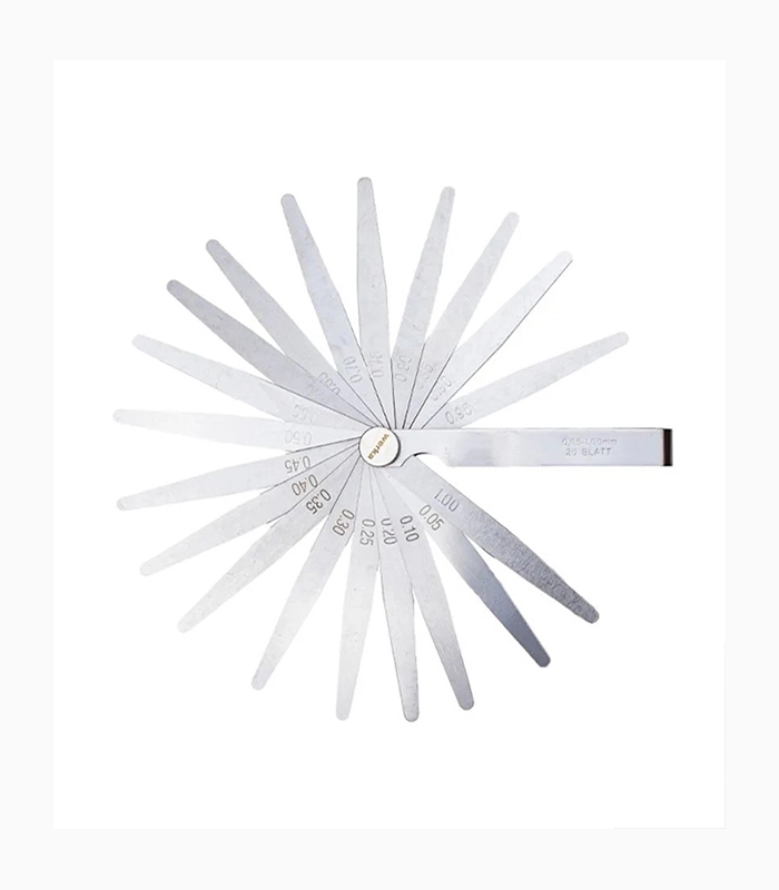 آچار فیلر به مدل تیغه ای معروف می باشد که در بر گیرنده تیغه هایی در سایز های 0.05 تا 1 میلیمتر می باشد که برای اندازه گیری دهانه سوپاپ های انواع موتور کاربرد دارد که بسته به نوع موتور در طول های متفاوتی تولید می شود. از آچار فیلر برای اندازه گیری فواصل خیلی کوچک موجود بین دو قطعه استفاده می کنند . هر تیغه فیلر ، دارای ضخامت دقیق و حساب شده ای است و اندازه ی تیغه را بر حسب صدم میلیمتر یا هزارم اینچ روی آن حک می نمایند . گاهی این فیلر ها دارای اندازه متریک و اینچی هستند. برای استفاده از این ابزار ، تیغه ی مناسبی را در فاصله ی لقی مورد نظر قرار می دهند . هرگاه فیلر در آن به طور جذب قرار گیرد ، فاصله بین دو قطعه به اندازه ضخامت تیغه فیلر خواهد بود.